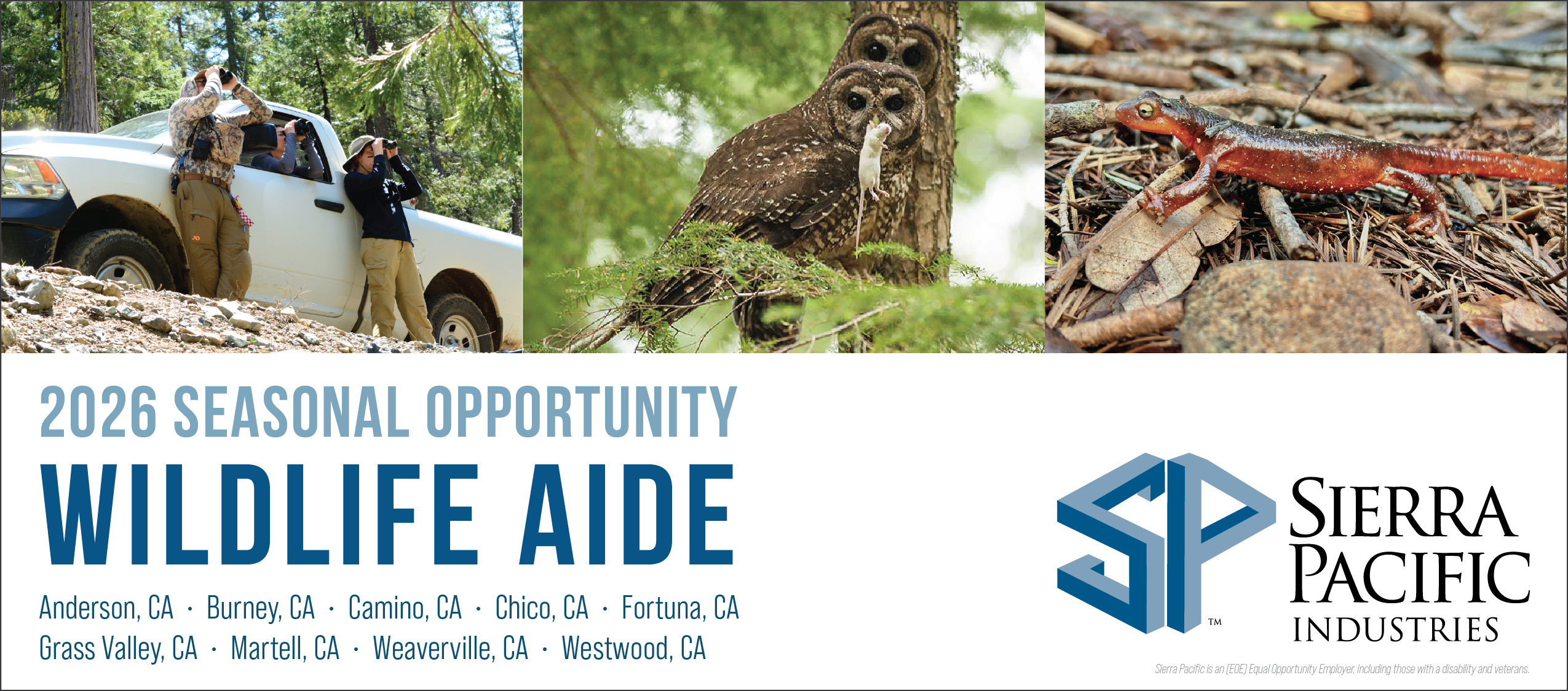 Wages range from $22 to $26 per hourQualified Wildlife Biologist Aides help manage the Company's forest lands in California. Primary species being surveyed will be the Spotted Owl and American Goshawk. This position provides an excellent opportunity to observe Spotted Owls from many known sites. Last season, our crew documented over 300 Spotted Owls.
