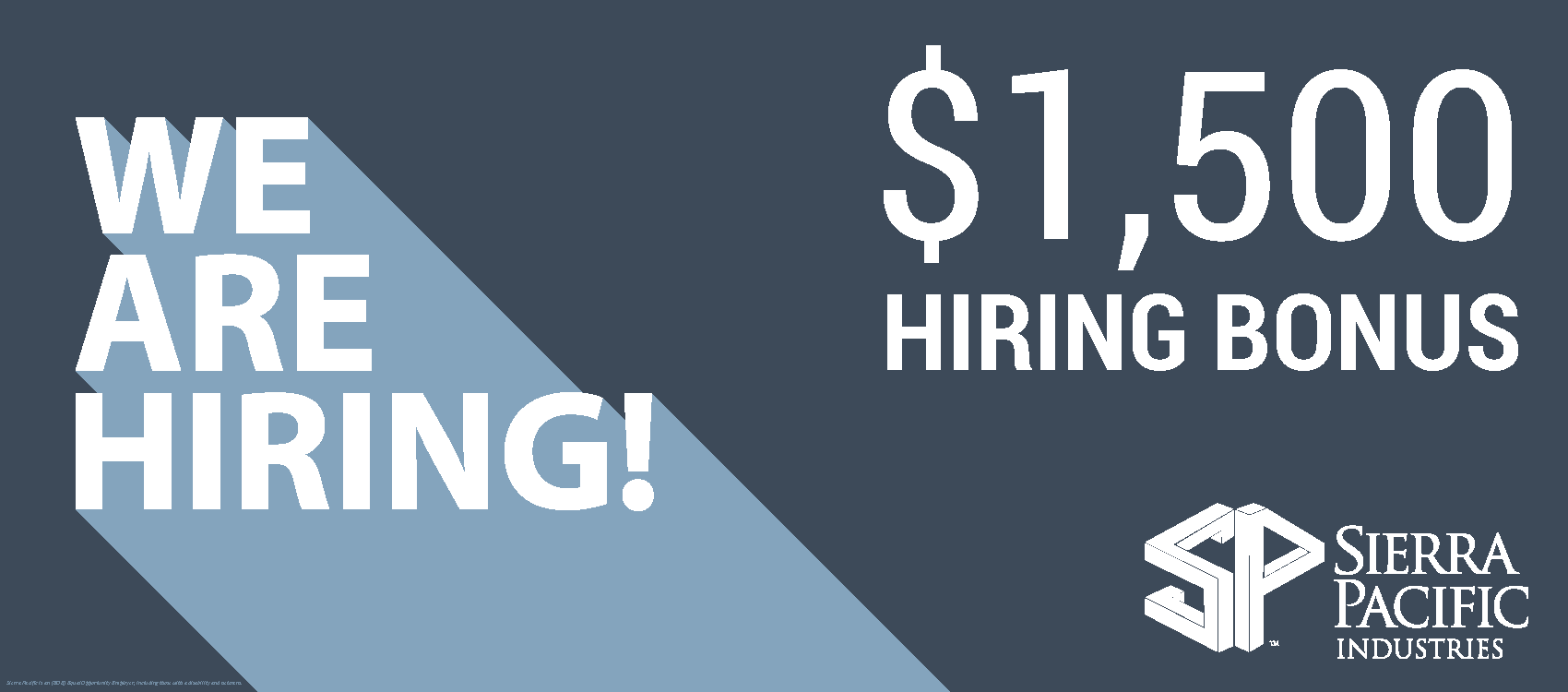 We are proud that all Sierra Pacific facilities follow our drug-free and tobacco-free policies. As part of our safety in the workplace policy, an offer of employment is subject to a negative drug screen result. We use E-verify to verify the social security number and work authorization of all newly hired employees. Sierra Pacific is an (EOE) Equal Opportunity Employer, including those with a disability and veterans.